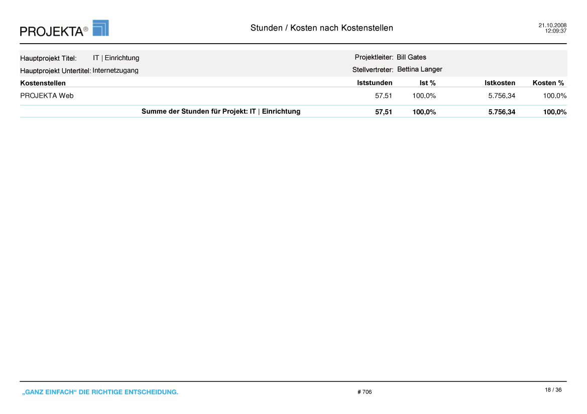 Der Bericht Stunden und Kosten nach Kostenstellen (A7060) zeigt die Ist-Stunden und -Kosten eines Projektes je Kostenstelle in tabellarischer Form.