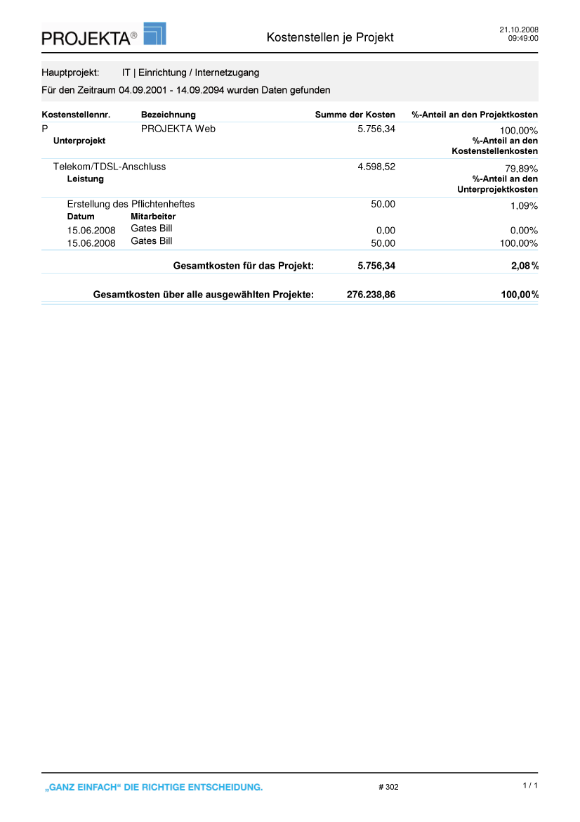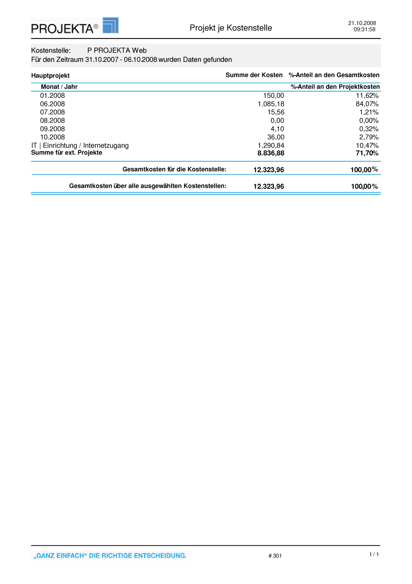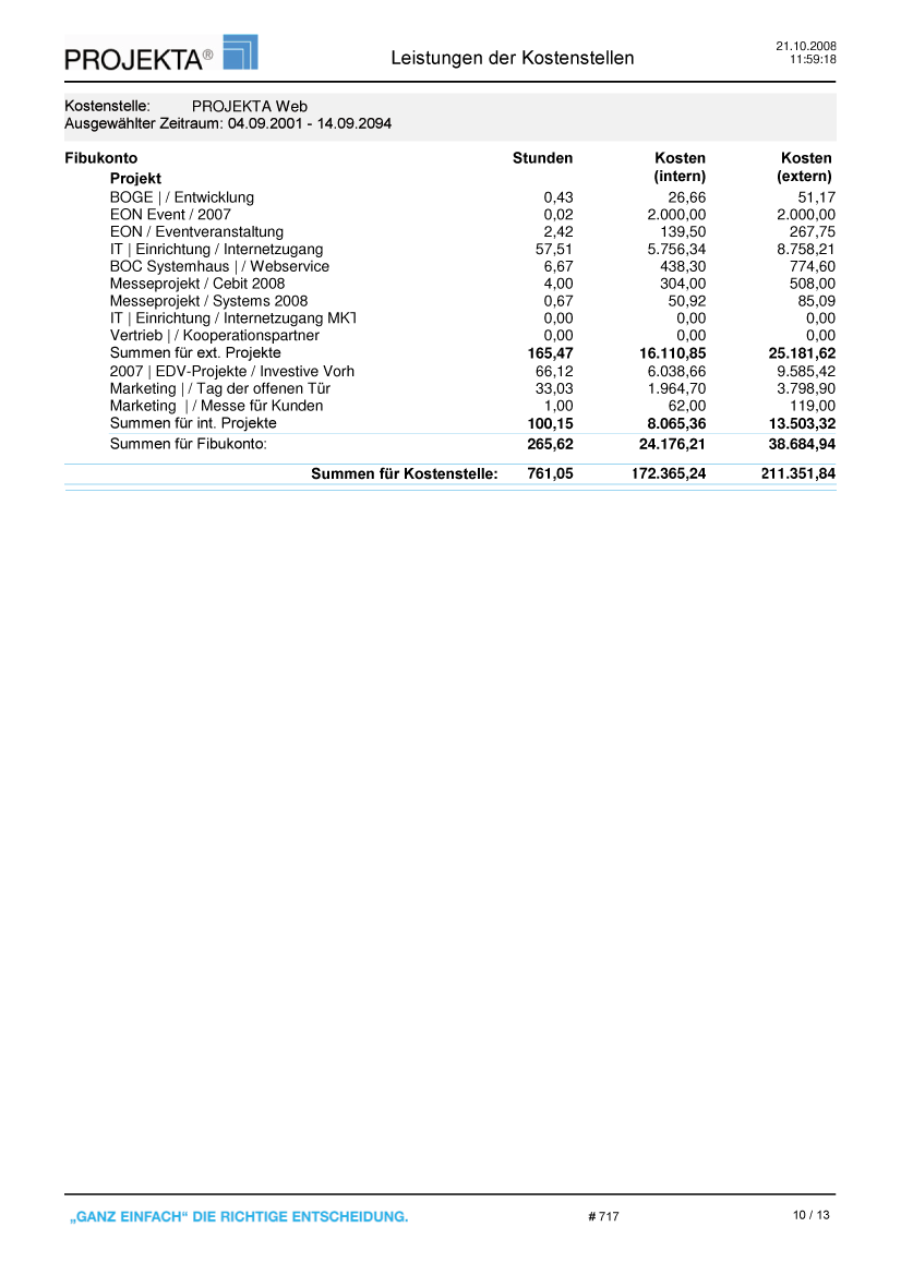 Der Bericht Projekt je Kostenstelle (A3010) zeigt die Kosten aller Projekte einer Ressource innerhalb eines Zeitraums - aufgeteilt nach internen und externen Projekten. Zusätzlich erscheinen die Summen nach Projektart und gesamt.