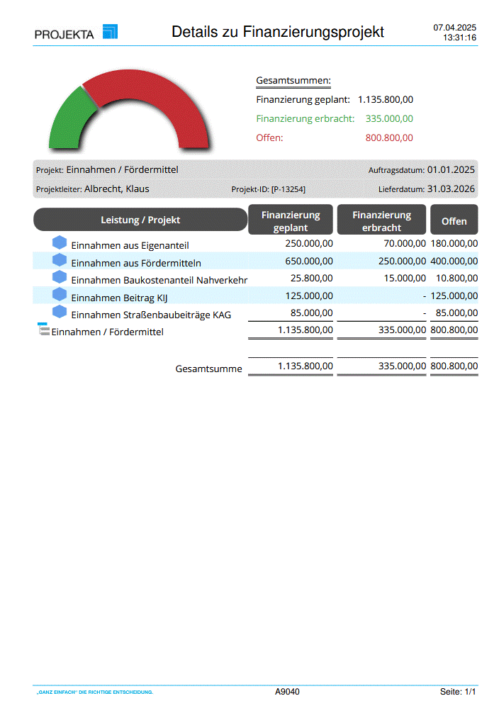 Der Bericht Details zu Finanzierungsprojekt (A9040) enthält eine Aufstellung von geplanten, erbrachten und offenen Finanzierungen eines Projektes. Dies erhalten Sie in einer grafischen Darstellung.