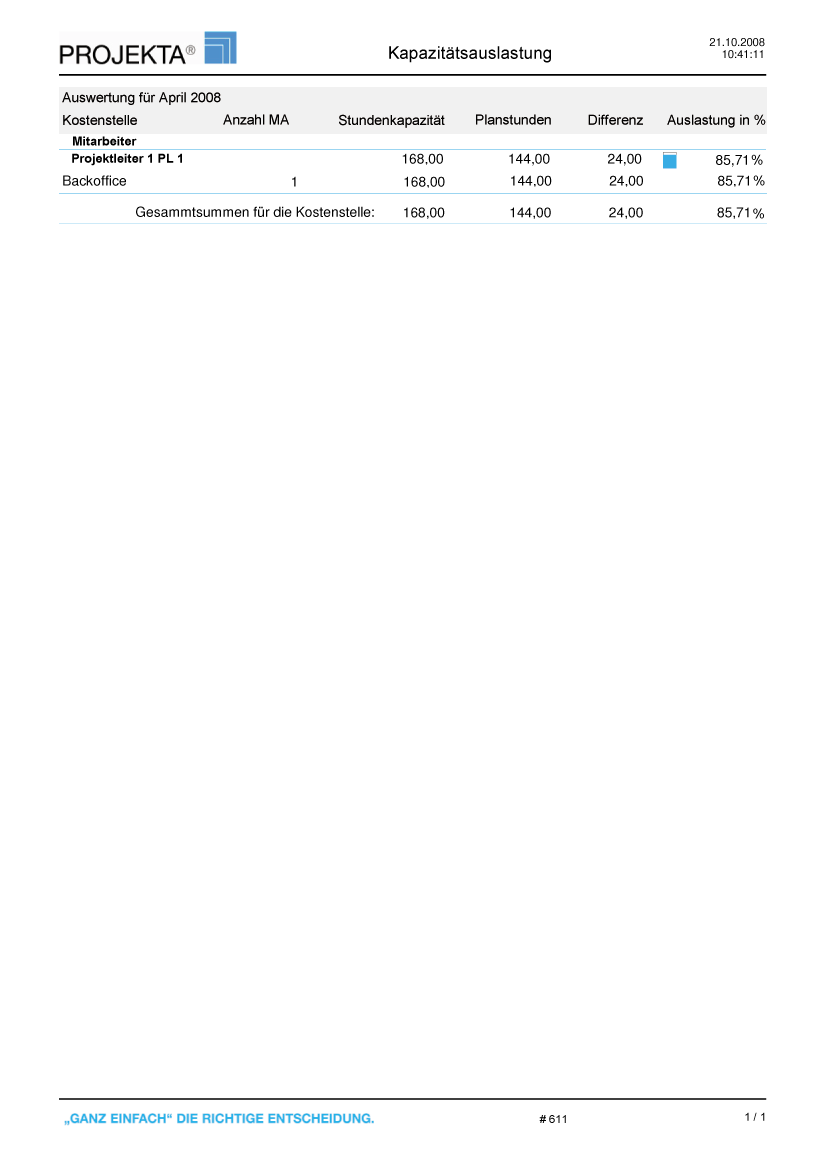 Der Bericht Kapazitätsauslastung (A6110) stellt tabellarisch die Auswertung der Kapazitätsauslastung je Monat dar. Ausgewiesen werden u.a. die Kostenstelle, die Anzahl an Mitarbeitern, die Planstunden und die Auslastung in %.