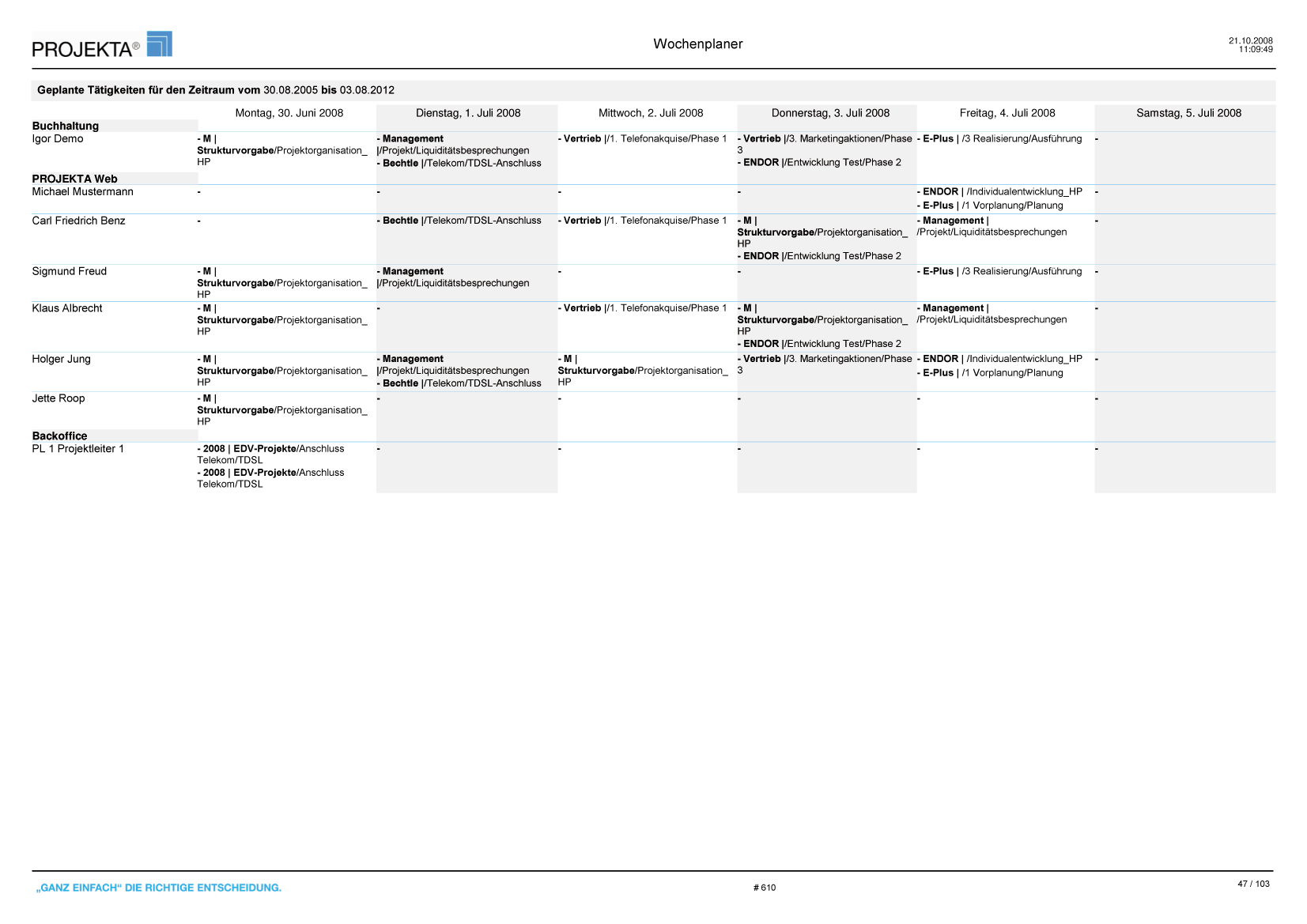 In dem Bericht Mitarbeiterauslastung Balkenplan (A608) bereitet PROJEKTA die Auslastung eines Mitarbeiters grafisch auf. Es lassen sich Auslastungen von bis zu 5 Tagen miteinander vergleichen.Terminübersicht Woche (A6200)