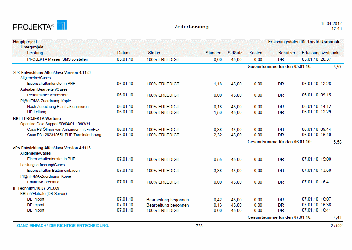 Der Bericht Zeiterfassung (A7330) zeigt die erfassten Zeiten einer Ressource für einen bestimmten Zeitraum in tabellarischer Form.