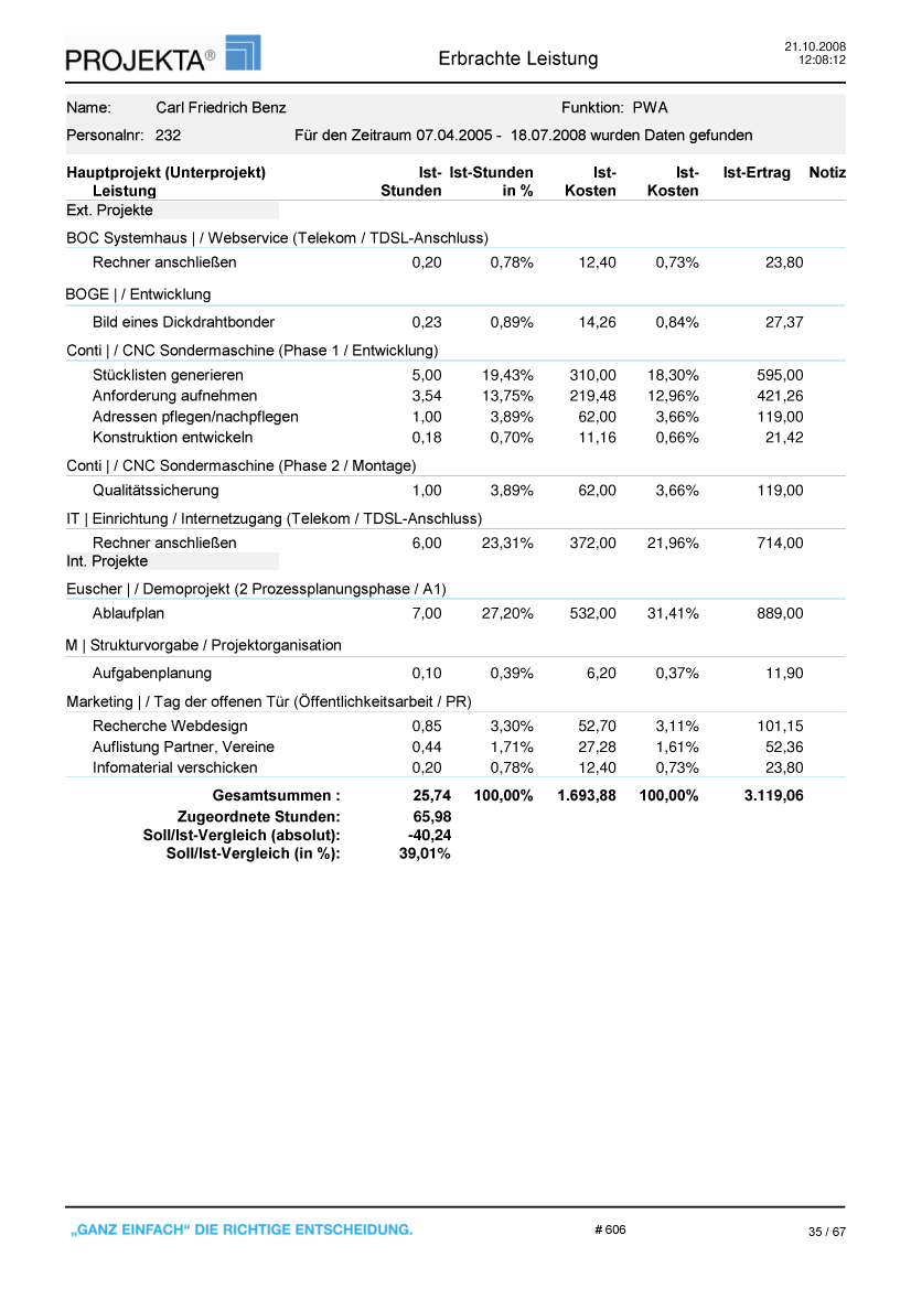 Der Bericht Erbrachte Leistung (A6060) zeigt die Gesamtanzahl erbrachter Stunden je Mitarbeiter innerhalb eines Zeitraums - aufgeteilt nach Projekten und Leistungen als Soll-/ Ist-Gegenüberstellung mit Ertrag und Gesamtsummen.
