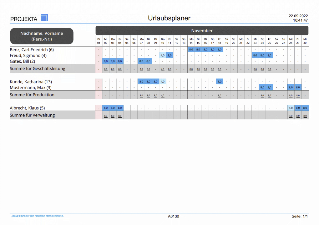 Der Bericht Urlaubsplaner (A6130) gibt Ihnen Informationen zum geplanten Urlaub aller Ressourcen sortiert nach Kostenstellen. Feiertage sind rot, ganze Urlaubstage dunkelblau, halbe Urlaubstage hellblau und die Summenzeilen grau hinterlegt.
